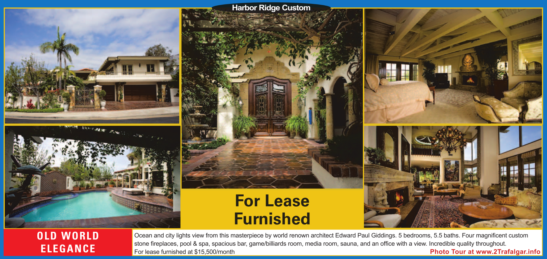 Ocean and city lights view from this masterpiece by world renown architect Edward Paul Giddings. 5 bedrooms, 5.5 baths. Four magnificent custom stone fireplaces, pool & spa, spacious bar, game/billiards room, media room, sauna, and an office with a view. Incredible quality throughout. For lease furnished at $15,500/month Photo Tour at www.2Trafalgar.info
