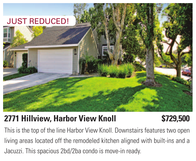JUST REDUCED! 2771 Hillview, Harbor View Knoll $729,500 This is the top of the line Harbor View Knoll. Downstairs features two open living areas located off the remodeled kitchen aligned with built-ins and a Jacuzzi. This spacious 2bd/2ba condo is move-in ready. See also