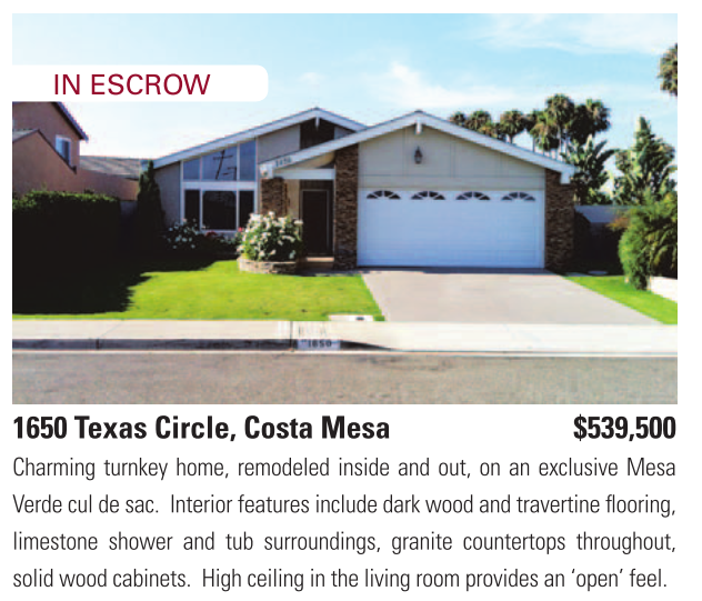 1650 Texas Circle, Costa Mesa $539,500 Charming turnkey home, remodeled inside and out, on an exclusive Mesa Verde cul de sac. Interior features include dark wood and travertine flooring, limestone shower and tub surroundings, granite countertops throughout, solid wood cabinets. High ceiling in the living room provides an ‘open’ feel.