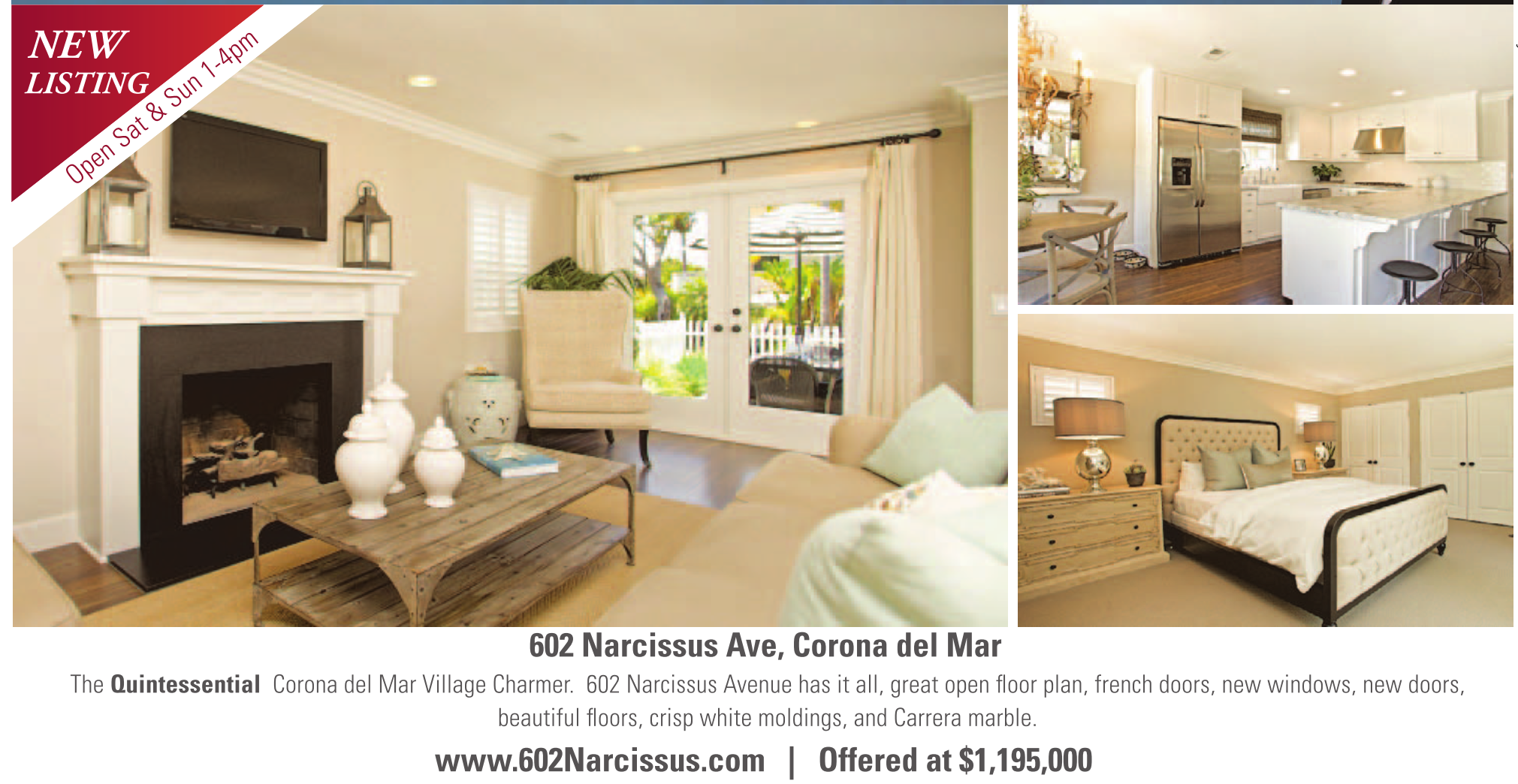 NEW LISTING 602 Narcissus Ave, Corona del Mar The Quintessential Corona del Mar Village Charmer. 602 Narcissus Avenue has it all, great open fl oor plan, french doors, new windows, new doors, beautiful fl oors, crisp white moldings, and Carrera marble. www.602Narcissus.com | Offered at $1,195,000