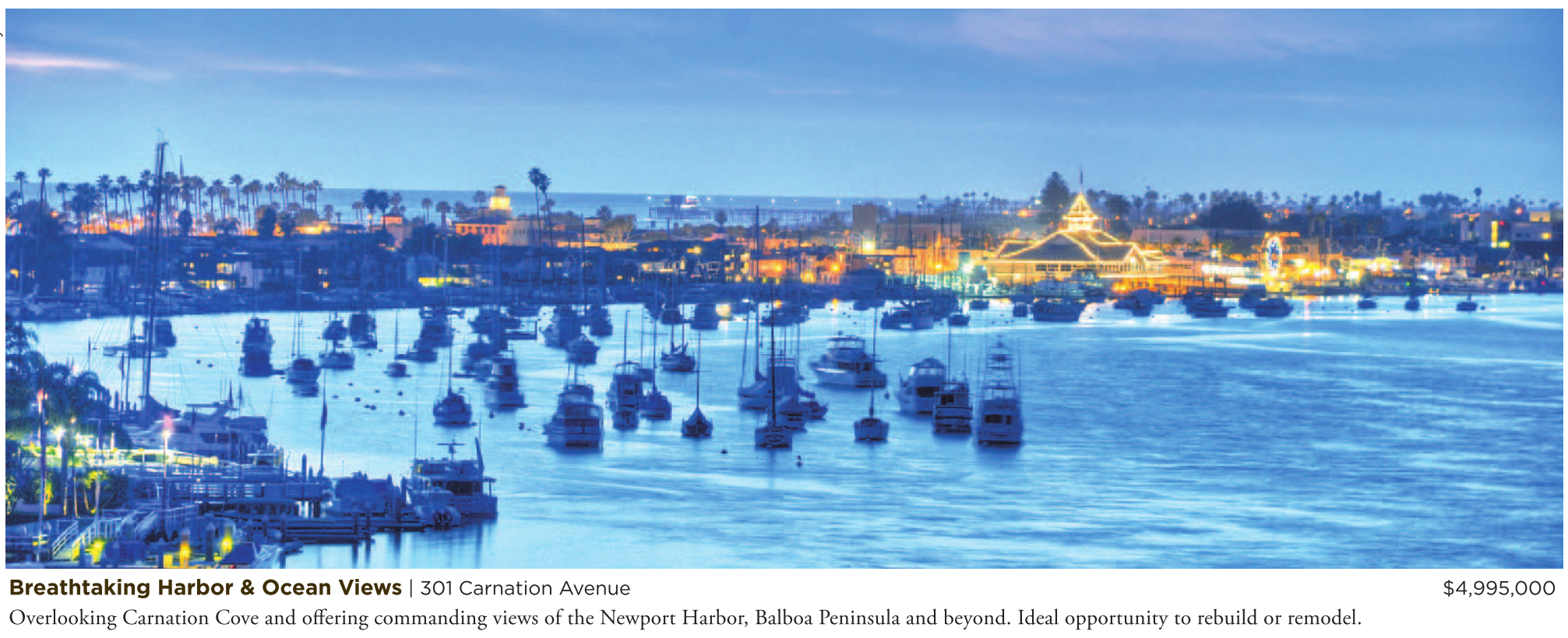 Breathtaking Harbor & Ocean Views | 301 Carnation Avenue $4,995,000 Overlooking Carnation Cove and offering commanding views of the Newport Harbor, Balboa Peninsula and beyond. Ideal opportunity to rebuild or remodel.