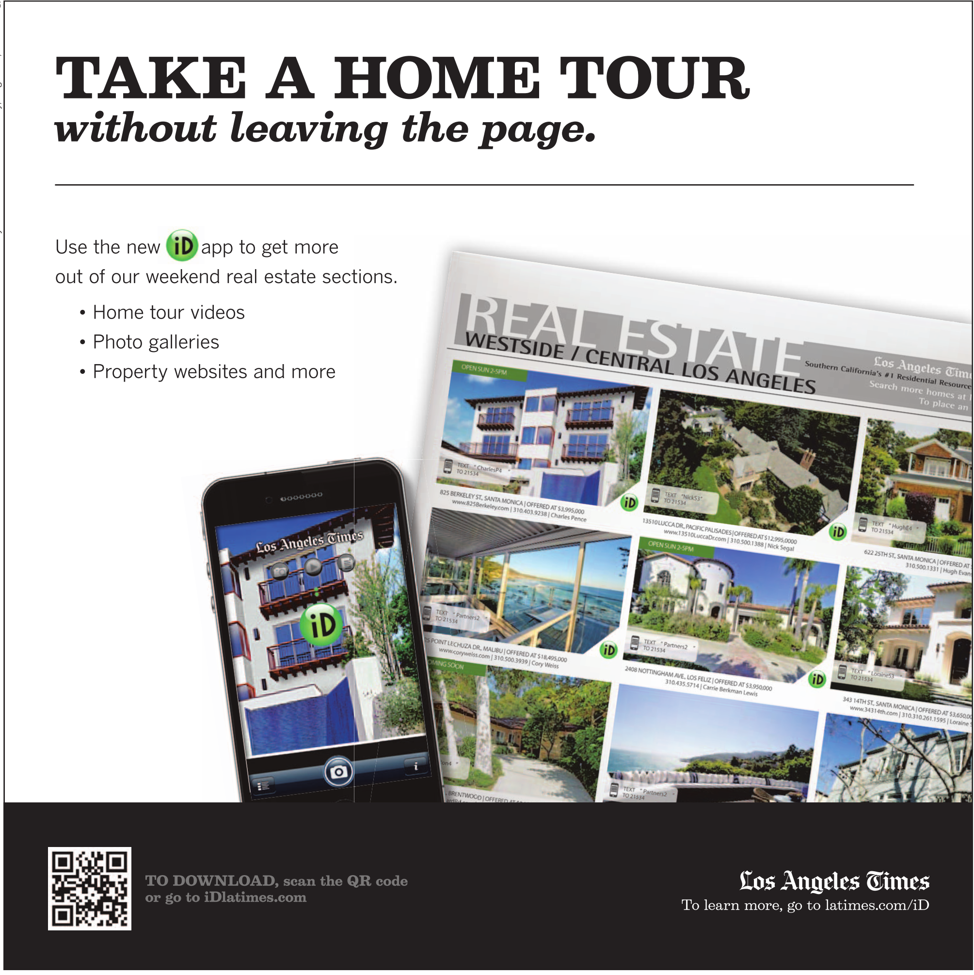 66 TAKE A HOME TOUR without leaving the page. Use the new app to get more out of our weekend real estate sections. • Home tour videos • Photo galleries • Property websites and more TO DOWNLOAD, scan the QR code or go to iDlatimes.com To learn more, go to latimes.com/iD