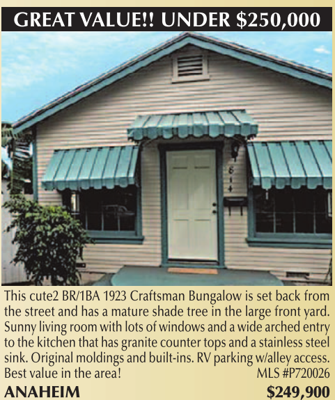 GREAT VALUE!! UNDER $250,000 This cute2 BR/1BA 1923 Craftsman Bungalow is set back from the street and has a mature shade tree in the large front yard. Sunny living room with lots of windows and a wide arched entry to the kitchen that has granite counter tops and a stainless steel sink. Original moldings and built-ins. RV parking w/alley access. Best value in the area! MLS #P720026 ANAHEIM $249,900