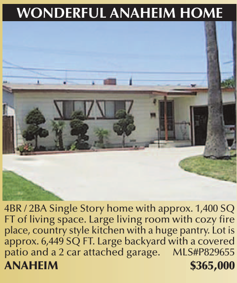 WONDERFUL ANAHEIM HOME 4BR / 2BA Single Story home with approx. 1,400 SQ FT of living space. Large living room with cozy fire place, country style kitchen with a huge pantry. Lot is approx. 6,449 SQ FT. Large backyard with a covered patio and a 2 car attached garage. MLS#P829655 ANAHEIM $365,000