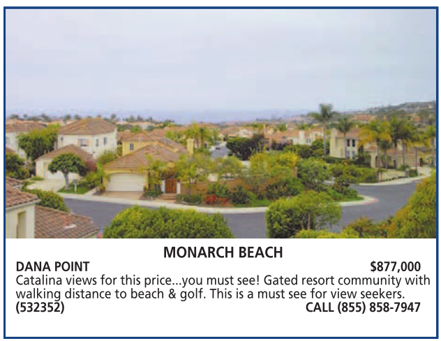 MONARCH BEACH DANA POINT $877,000 Catalina views for this price...you must see! Gated resort community with walking distance to beach & golf. This is a must see for view seekers. (532352) CALL (855) 858-7947