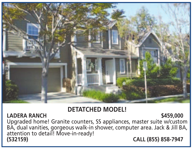 LADERA RANCH $459,000 Upgraded home! Granite counters, SS appliances, master suite w/custom BA, dual vanities, gorgeous walk-in shower, computer area. Jack & Jill BA, attention to detail! Move-in-ready! (532159) CALL (855) 858-7947