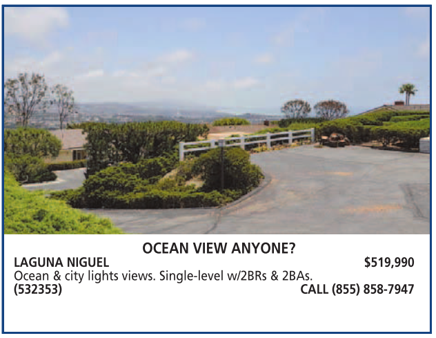 LAGUNA NIGUEL $519,990 Ocean & city lights views. Single-level w/2BRs & 2BAs. (532353) CALL (855) 858-7947