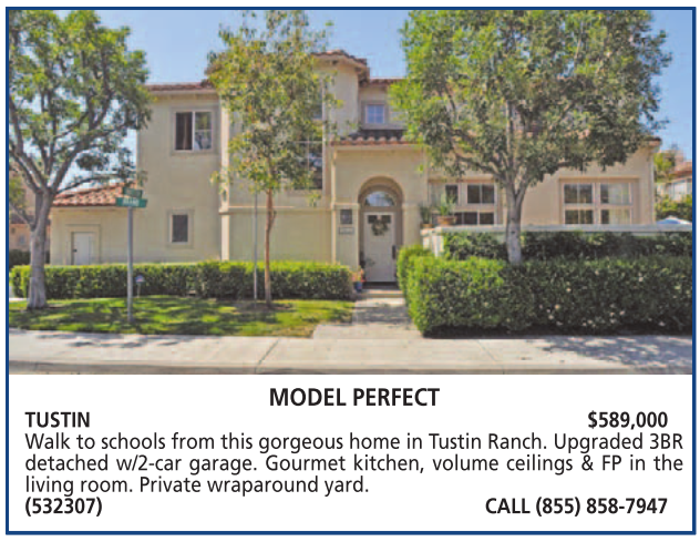 MODEL PERFECT TUSTIN $589,000 Walk to schools from this gorgeous home in Tustin Ranch. Upgraded 3BR detached w/2-car garage. Gourmet kitchen, volume ceilings & FP in the living room. Private wraparound yard. (532307) CALL (855) 858-7947