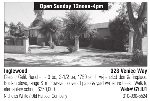 Open Sunday 12noon-4pm Inglewood 323 Venice Way Classic Calif. Rancher - 3 bd, 2-1/2 ba, 1750 sq ft, w/paneled den & fireplace. Built-in stove, range & microwave. covered patio & yard w/mature trees. Walk to elementary school. $350,000. Web# GYJU1 Nicholas White / Old Harbour Company 310-990-5524
