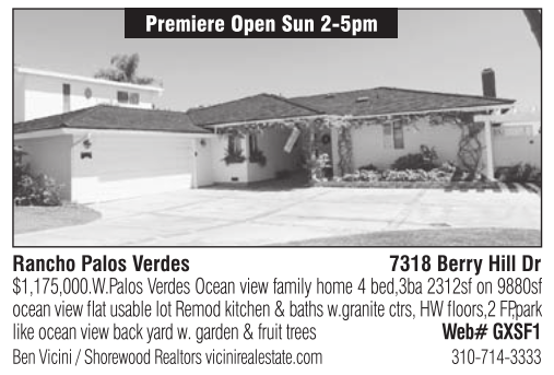 Premiere Open Sun 2-5pm Rancho Palos Verdes 7318 Berry Hill Dr $1,175,000.W.Palos Verdes Ocean view family home 4 bed,3ba 2312sf on 9880sf ocean view flat usable lot Remod kitchen & baths w.granite ctrs, HW floors,2 FP,park like ocean view back yard w. garden & fruit trees Web# GXSF1 Ben Vicini / Shorewood Realtors vicinirealestate.com 310-714-3333
