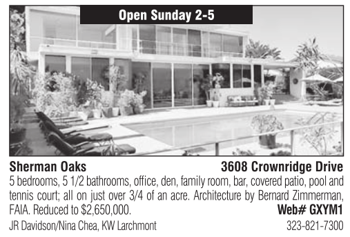 Open Sunday 2-5 Sherman Oaks 3608 Crownridge Drive 5 bedrooms, 5 1/2 bathrooms, office, den, family room, bar, covered patio, pool and tennis court; all on just over 3/4 of an acre. Architecture by Bernard Zimmerman, FAIA. Reduced to $2,650,000. Web# GXYM1 JR Davidson/Nina Chea, KW Larchmont 323-821-7300