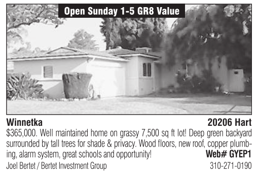 Open Sunday 1-5 GR8 Value Winnetka 20206 Hart $365,000. Well maintained home on grassy 7,500 sq ft lot! Deep green backyard surrounded by tall trees for shade & privacy. Wood floors, new roof, copper plumbing, alarm system, great schools and opportunity! Web# GYEP1 Joel Bertet / Bertet Investment Group 310-271-0190