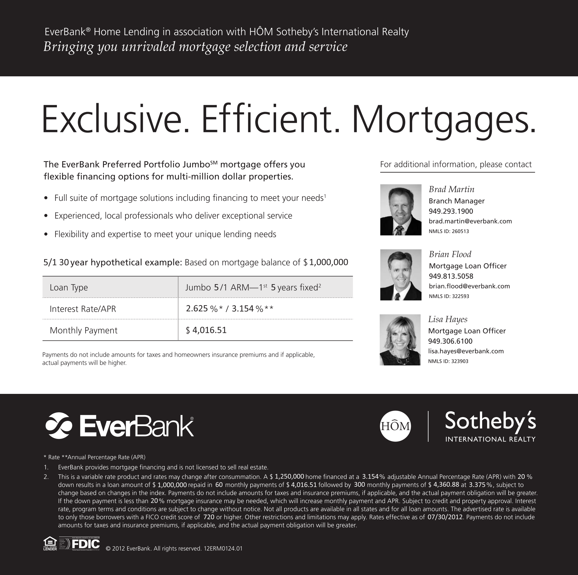 * Rate **Annual Percentage Rate (APR) 1. EverBank provides mortgage financing and is not licensed to sell real estate. 2. This is a variable rate product and rates may change after consummation. A $ 1,250,000 home financed at a 3.154% adjustable Annual Percentage Rate (APR) with 20 % down results in a loan amount of $ 1,000,000 repaid in 60 monthly payments of $ 4,016.51 followed by 300 monthly payments of $ 4,360.88 at 3.375%, subject to change based on changes in the index. Payments do not include amounts for taxes and insurance premiums, if applicable, and the actual payment obligation will be greater. If the down payment is less than 20% mortgage insurance may be needed, which will increase monthly payment and APR. Subject to credit and property approval. Interest rate, program terms and conditions are subject to change without notice. Not all products are available in all states and for all loan amounts. The advertised rate is available to only those borrowers with a FICO credit score of 720 or higher. Other restrictions and limitations may apply. Rates effective as of 07/30/2012. Payments do not include amounts for taxes and insurance premiums, if applicable, and the actual payment obligation will be greater.