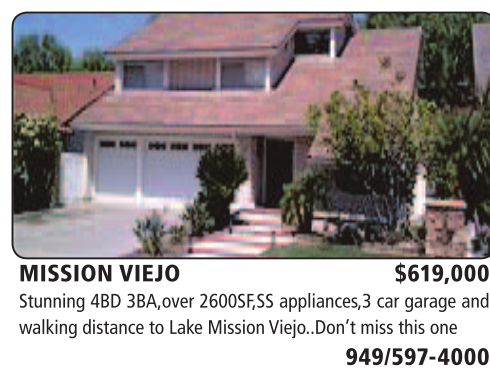 MISSION VIEJO $619,000 Stunning 4BD 3BA,over 2600SF,SS appliances,3 car garage and walking distance to Lake Mission Viejo..Don’t miss this one 949/597-4000