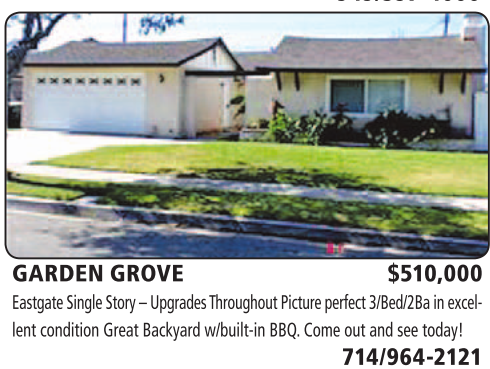 GARDEN GROVE $510,000 Eastgate Single Story – Upgrades Throughout Picture perfect 3/Bed/2Ba in excellent condition Great Backyard w/built-in BBQ. Come out and see today!
