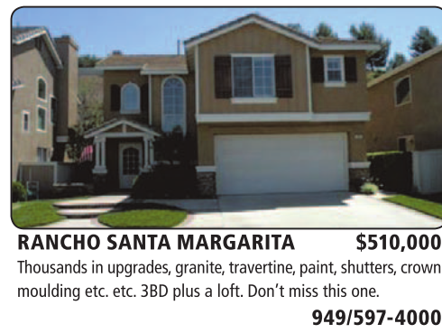 RANCHO SANTA MARGARITA $510,000 Thousands in upgrades, granite, travertine, paint, shutters, crown moulding etc. etc. 3BD plus a loft. Don’t miss this one.