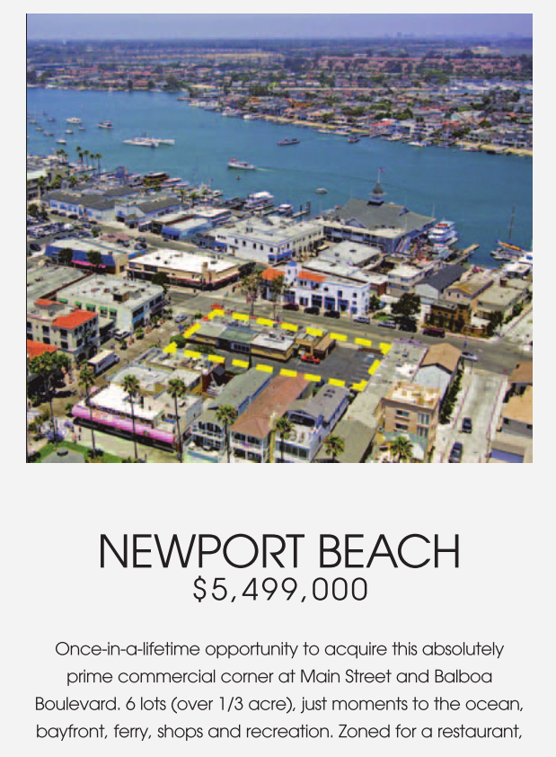 Once-in-a-lifetime opportunity to acquire this absolutely prime commercial corner at Main Street and Balboa Boulevard. 6 lots (over 1/3 acre), just moments to the ocean, bayfront, ferry, shops and recreation. Zoned for a restaurant,