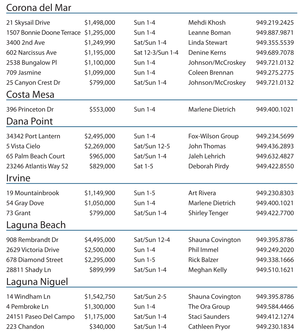 908 Rembrandt Dr $4,495,000 Sat/Sun 12-4 Shauna Covington 949.395.8786 2629 Victoria Drive $2,500,000 Sun 1-4 Phil Immel 949.249.2020 678 Diamond Street $2,295,000 Sun 1-5 Rick Balzer 949.338.1666 28811 Shady Ln $899,999 Sat/Sun 1-4 Meghan Kelly 949.510.1621