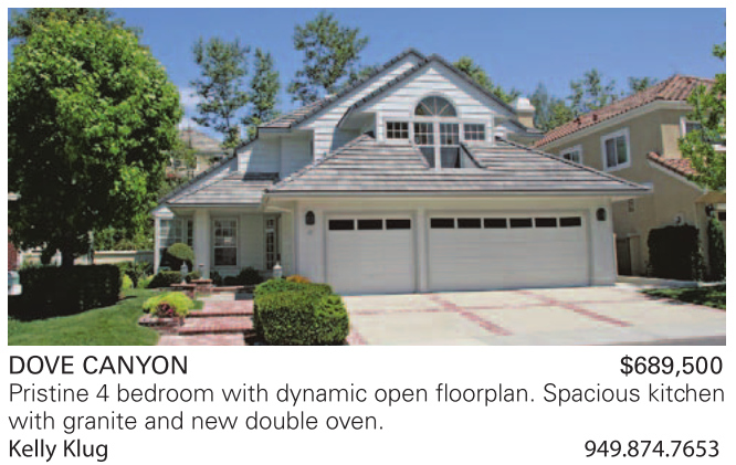 DOVE CANYON $689,500 Pristine 4 bedroom with dynamic open floorplan. Spacious kitchen with granite and new double oven. Kelly Klug 949.874.7653