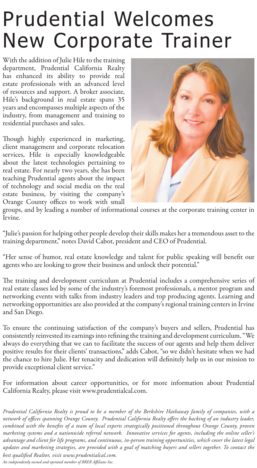 Prudential California Realty is proud to be a member of the Berkshire Hathaway family of companies, with a network of offices spanning Orange County. Prudential California Realty offers the backing of an industry leader, combined with the benefits of a team of local experts strategically positioned throughout Orange County, proven marketing systems and a nationwide referral network. Innovative services for agents, including the online seller’s advantage and client for life programs, and continuous, in-person training opportunities, which cover the latest legal updates and marketing strategies, are provided with a goal of matching buyers and sellers together. To contact the best qualified Realtor, visit www.prudentialcal.com. An independently owned and operated member of BRER Affiliates Inc.