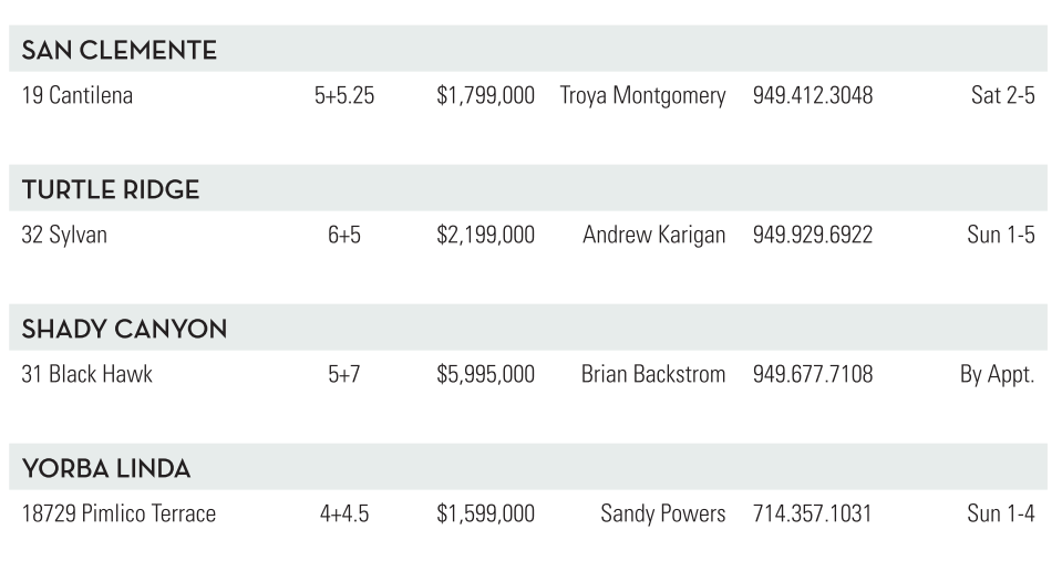 SAN CLEMENTE 19 Cantilena 5+5.25 $1,799,000 Troya Montgomery 949.412.3048 Sat 2-5 TURTLE RIDGE 32 Sylvan 6+5 $2,199,000 Andrew Karigan 949.929.6922 Sun 1-5 SHADY CANYON 31 Black Hawk 5+7 $5,995,000 Brian Backstrom 949.677.7108 By Appt. YORBA LINDA 18729 Pimlico Terrace 4+4.5 $1,599,000 Sandy Powers 714.357.1031 Sun 1-4