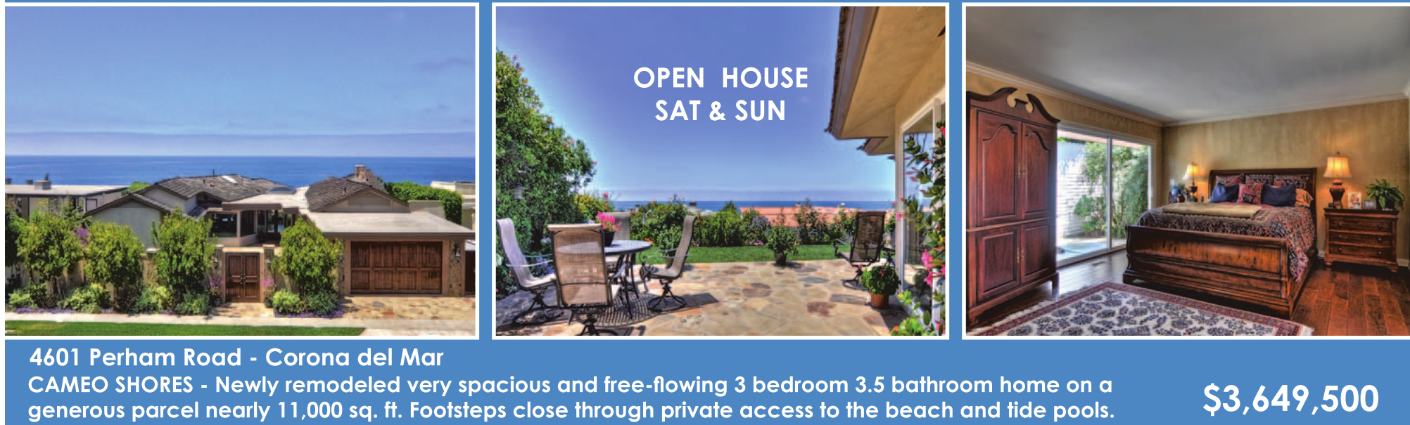 OPEN HOUSE SAT & SUN 4601 Perham Road - Corona del Mar CAMEO SHORES - Newly remodeled very spacious and free-flowing 3 bedroom 3.5 bathroom home on a generous parcel nearly 11,000 sq. ft. Footsteps close through private access to the beach and tide pools. $3,649,500