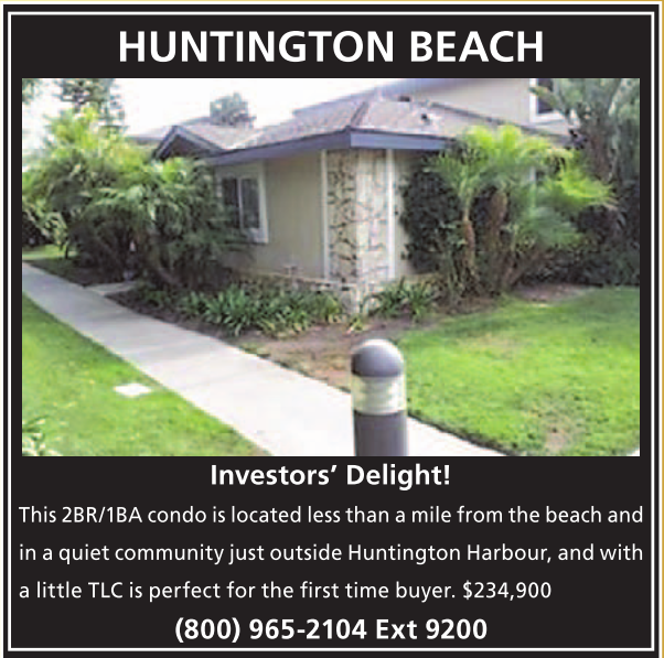 This 2BR/1BA condo is located less than a mile from the beach and in a quiet community just outside Huntington Harbour, and with a little TLC is perfect for the first time buyer. $234,900 (800) 965-2104 Ext 9200