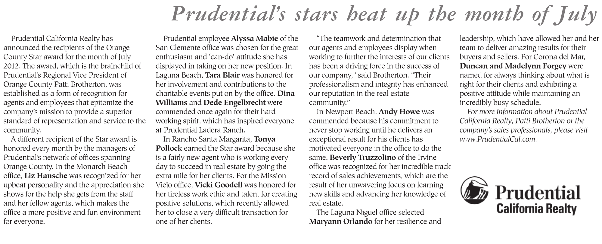 Prudential California Realty has announced the recipients of the Orange County Star award for the month of July 2012. The award, which is the brainchild of Prudential’s Regional Vice President of Orange County Patti Brotherton, was established as a form of recognition for agents and employees that epitomize the company’s mission to provide a superior standard of representation and service to the community.