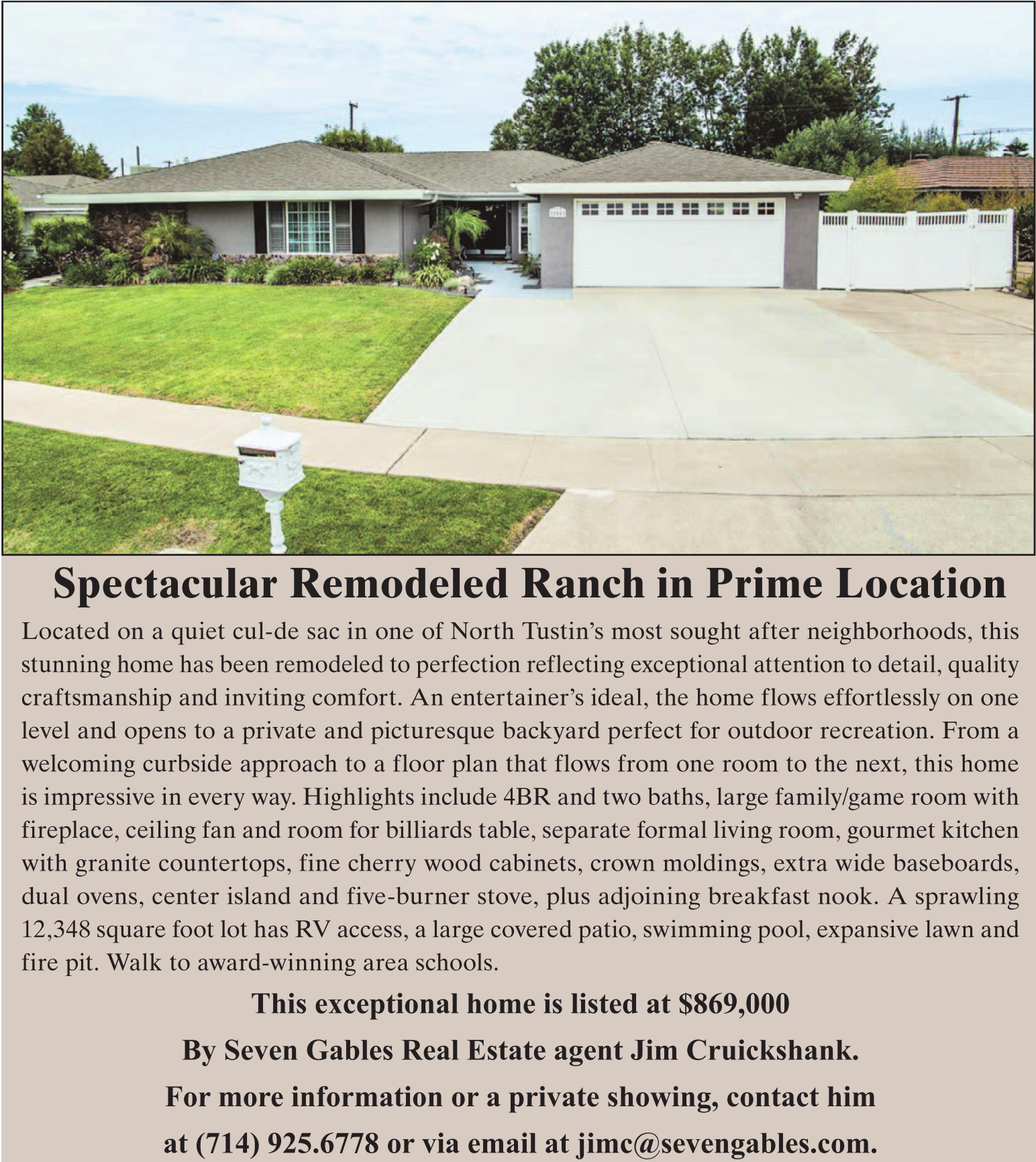 Spectacular Remodeled Ranch in Prime Location Located on a quiet cul-de sac in one of North Tustin’s most sought after neighborhoods, this stunning home has been remodeled to perfection reflecting exceptional attention to detail, quality craftsmanship and inviting comfort. An entertainer’s ideal, the home flows effortlessly on one level and opens to a private and picturesque backyard perfect for outdoor recreation. From a welcoming curbside approach to a floor plan that flows from one room to the next, this home is impressive in every way. Highlights include 4BR and two baths, large family/game room with fireplace, ceiling fan and room for billiards table, separate formal living room, gourmet kitchen with granite countertops, fine cherry wood cabinets, crown moldings, extra wide baseboards, dual ovens, center island and five-burner stove, plus adjoining breakfast nook. A sprawling 12,348 square foot lot has RV access, a large covered patio, swimming pool, expansive lawn and fire pit. Walk to award-winning area schools. This exceptional home is listed at $869,000 By Seven Gables Real Estate agent Jim Cruickshank. For more information or a private showing, contact him at (714) 925.6778 or via email at jimc@sevengables.com.