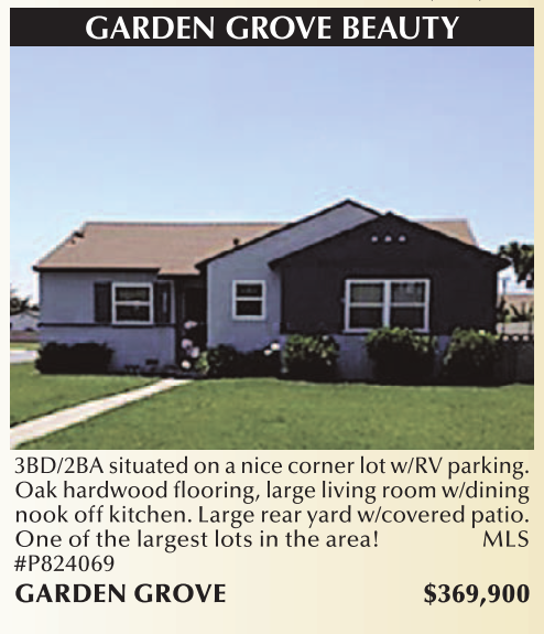 3BD/2BA situated on a nice corner lot w/RV parking. Oak hardwood flooring, large living room w/dining nook off kitchen. Large rear yard w/covered patio. One of the largest lots in the area! MLS #P824069 GARDEN GROVE $369,900