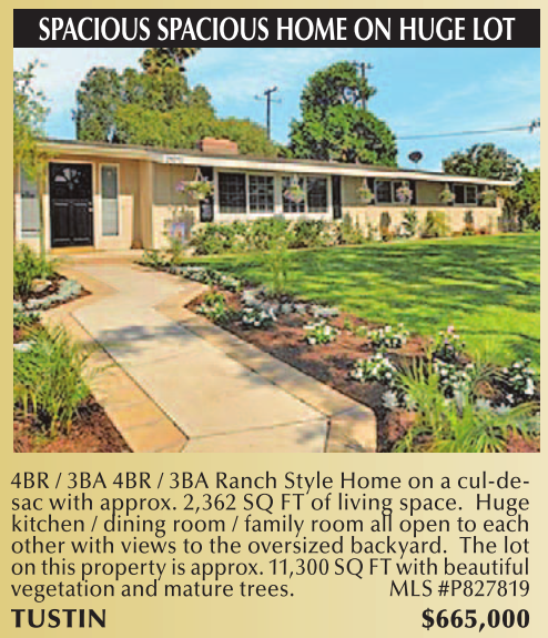 SPACIOUS SPACIOUS HOME ON HUGE LOT 4BR / 3BA 4BR / 3BA Ranch Style Home on a cul-desac with approx. 2,362 SQ FT of living space. Huge kitchen / dining room / family room all open to each other with views to the oversized backyard. The lot on this property is approx. 11,300 SQ FT with beautiful vegetation and mature trees. MLS #P827819 TUSTIN $665,000