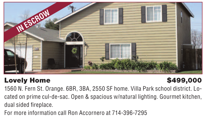 Lovely Home $499,000 1560 N. Fern St. Orange. 6BR, 3BA, 2550 SF home. Villa Park school district. Located on prime cul-de-sac. Open & spacious w/natural lighting. Gourmet kitchen, dual sided fi replace. For more information call Ron Accornero at 714-396-7295