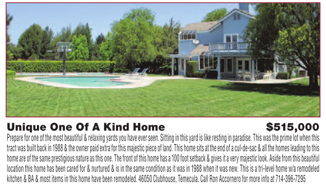 Unique One Of A Kind Home $515,000 Prepare for one of the most beautiful & relaxing yards you have ever seen. Sitting in this yard is like resting in paradise. This was the prime lot when this tract was built back in 1988 & the owner paid extra for this majestic piece of land. This home sits at the end of a cul-de-sac & all the homes leading to this home are of the same prestigious nature as this one. The front of this home has a 100 foot setback & gives it a very majestic look. Aside from this beautiful location this home has been cared for & nurtured & is in the same condition as it was in 1988 when it was new. This is a tri-level home w/a remodeled kitchen & BA & most items in this home have been remodeled. 46050 Clubhouse, Temecula. Call Ron Accornero for more info at 714-396-7295