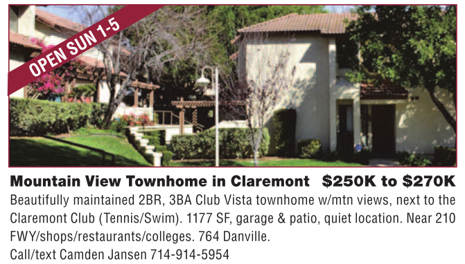 Mountain View Townhome in Claremont $250K to $270K Beautifully maintained 2BR, 3BA Club Vista townhome w/mtn views, next to the Claremont Club (Tennis/Swim). 1177 SF, garage & patio, quiet location. Near 210 FWY/shops/restaurants/colleges. 764 Danville. Call/text Camden Jansen 714-914-5954