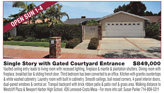 Single Story with Gated Courtyard Entrance $849,000 Vaulted ceiling entry leads to living room with recessed lighting, fi replace & mantle & plantation shutters. Dining room with fi replace, breakfast bar & sliding french door. Third bedroom has been converted to an offi ce. Kitchen with granite countertops & white washed cabinetry. Laundry room with built in cabinetry. Smooth ceilings, bull nosed corners, 4 panel interior doors, dual-paned windows & central air. Tranquil backyard with brick ribbon patio & patio roof & grass area. Walking distance to Westcliff Plaza & Newport Harbor High School. 426 Lenwood-Costa Mesa - For more info call: Susan Parker 714-809-5311
