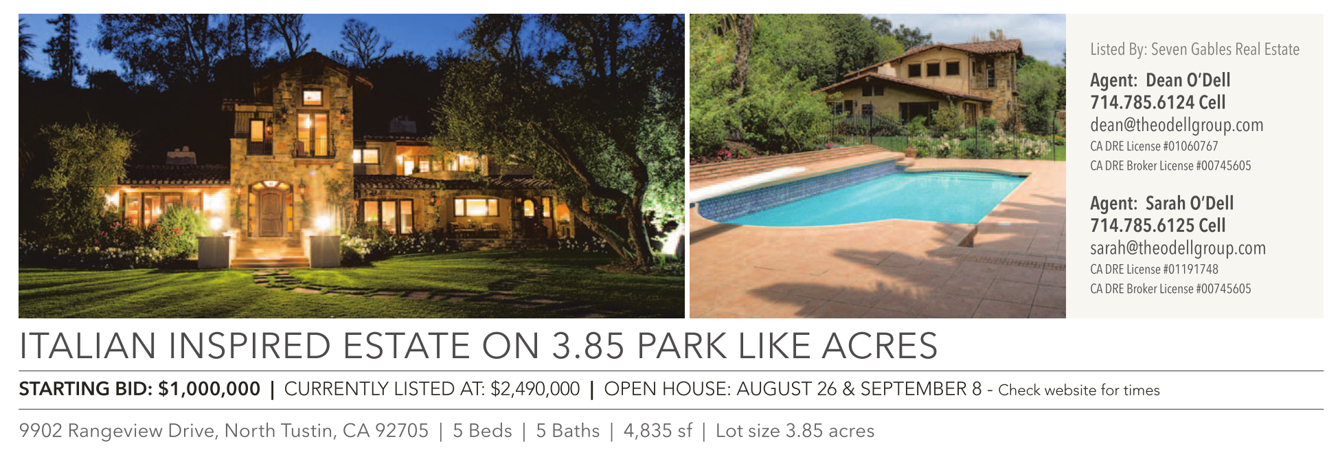 Listed By: Seven Gables Real Estate Agent: Dean O’Dell 714.785.6124 Cell dean@theodellgroup.com CA DRE License #01060767 CA DRE Broker License #00745605 Agent: Sarah O’Dell 714.785.6125 Cell sarah@theodellgroup.com CA DRE License #01191748 CA DRE Broker License #00745605 ITALIAN INSPIRED ESTATE ON 3.85 PARK LIKE ACRES STARTING BID: $1,000,000 | CURRENTLY LISTED AT: $2,490,000 | OPEN HOUSE: AUGUST 26 & SEPTEMBER 8 - Check website for times 9902 Rangeview Drive, North Tustin, CA 92705 | 5 Beds | 5 Baths | 4,835 sf | Lot size 3.85 acres See also