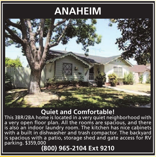 ANAHEIM Quiet and Comfortable! This 3BR/2BA home is located in a very quiet neighborhood with a very open floor plan. All the rooms are spacious, and there is also an indoor laundry room. The kitchen has nice cabinets with a built in dishwasher and trash compactor. The backyard is spacious with a patio, storage shed and gate access for RV parking. $359,000 (800) 965-2104 Ext 9210