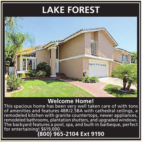 LAKE FOREST Welcome Home! This spacious home has been very well taken care of with tons of amenities and features 4BR/2.5BA with cathedral ceilings, a remodeled kitchen with granite countertops, newer appliances, remodeled bathrooms, plantation shutters, and upgraded windows. The backyard features a pool, spa, and built-in barbeque, perfect for entertaining! $619,000. (800) 965-2104 Ext 9190