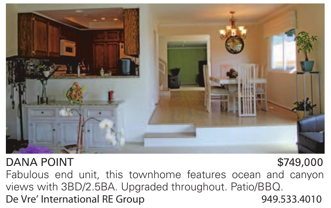 DANA POINT $749,000 Fabulous end unit, this townhome features ocean and canyon views with 3BD/2.5BA. Upgraded throughout. Patio/BBQ. De Vre’ International RE Group 949.533.4010