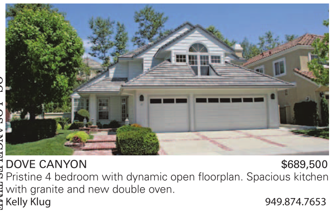 DOVE CANYON $689,500 Pristine 4 bedroom with dynamic open floorplan. Spacious kitchen with granite and new double oven. Kelly Klug 949.874.7653
