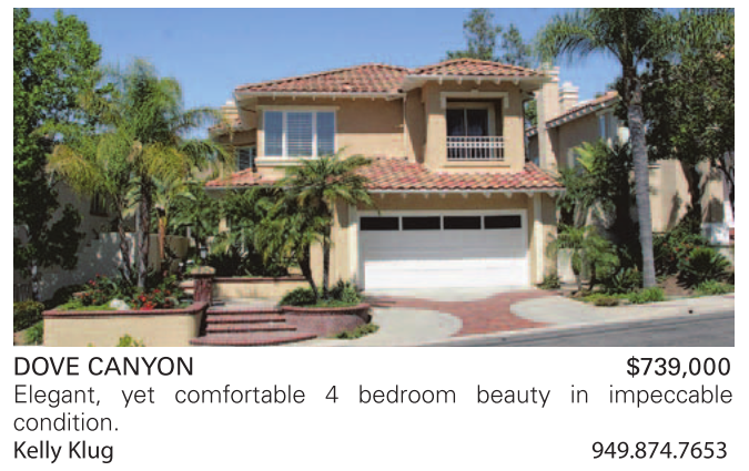 DOVE CANYON $739,000 Elegant, yet comfortable 4 bedroom beauty in impeccable condition. Kelly Klug 949.874.7653