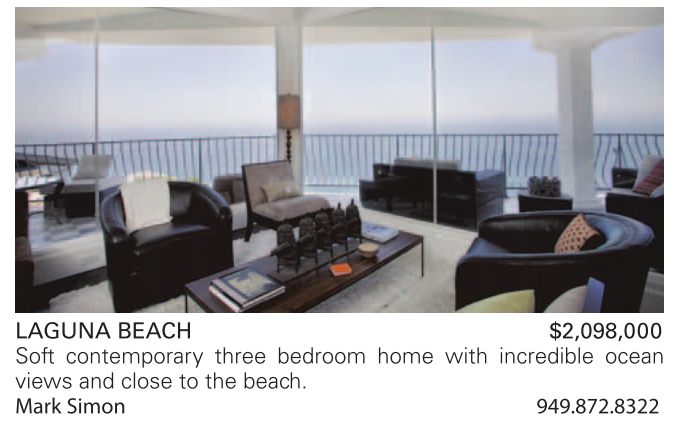 LAGUNA BEACH $2,098,000 Soft contemporary three bedroom home with incredible ocean views and close to the beach. Mark Simon 949.872.8322