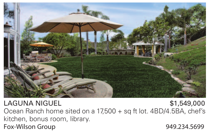 LAGUNA NIGUEL $1,549,000 Ocean Ranch home sited on a 17,500 + sq ft lot. 4BD/4.5BA, chef’s kitchen, bonus room, library. Fox-Wilson Group 949.234.5699