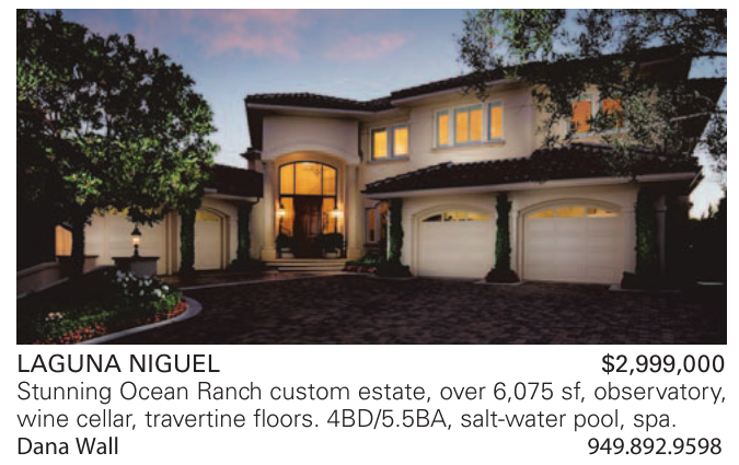 LAGUNA NIGUEL $2,999,000 Stunning Ocean Ranch custom estate, over 6,075 sf, observatory, wine cellar, travertine floors. 4BD/5.5BA, salt-water pool, spa. Dana Wall 949.892.9598