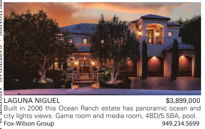 LAGUNA NIGUEL $3,899,000 Built in 2006 this Ocean Ranch estate has panoramic ocean and city lights views. Game room and media room, 4BD/5.5BA, pool. Fox-Wilson Group 949.234.5699