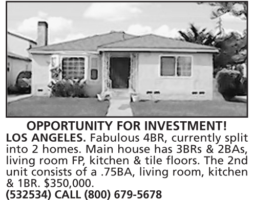 OPPORTUNITY FOR INVESTMENT! LOS ANGELES. Fabulous 4BR, currently split into 2 homes. Main house has 3BRs & 2BAs, living room FP, kitchen & tile floors. The 2nd unit consists of a .75BA, living room, kitchen & 1BR. $350,000. (532534) CALL (800) 679-5678