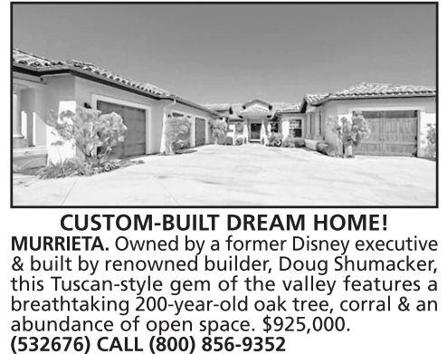 CUSTOM-BUILT DREAM HOME! MURRIETA. Owned by a former Disney executive & built by renowned builder, Doug Shumacker, this Tuscan-style gem of the valley features a breathtaking 200-year-old oak tree, corral & an abundance of open space. $925,000. (532676) CALL (800) 856-9352