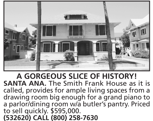 A GORGEOUS SLICE OF HISTORY! SANTA ANA. The Smith Frank House as it is called, provides for ample living spaces from a drawing room big enough for a grand piano to a parlor/dining room w/a butler’s pantry. Priced to sell quickly. $595,000. (532620) CALL (800) 258-7630