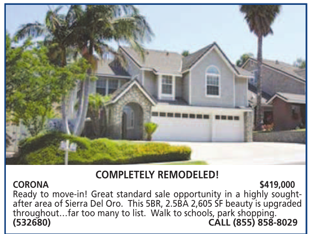 COMPLETELY REMODELED! CORONA $419,000 Ready to move-in! Great standard sale opportunity in a highly soughtafter area of Sierra Del Oro. This 5BR, 2.5BA 2,605 SF beauty is upgraded throughout…far too many to list. Walk to schools, park shopping. (532680) CALL (855) 858-8029