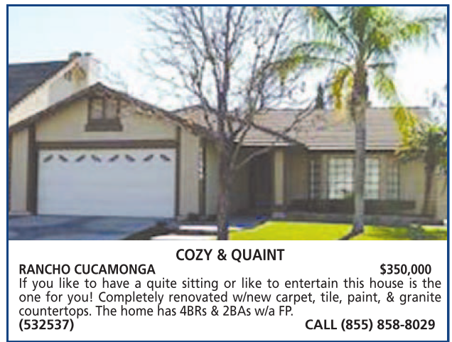 COZY & QUAINT RANCHO CUCAMONGA $350,000 If you like to have a quite sitting or like to entertain this house is the one for you! Completely renovated w/new carpet, tile, paint, & granite countertops. The home has 4BRs & 2BAs w/a FP. (532537) CALL (855) 858-8029
